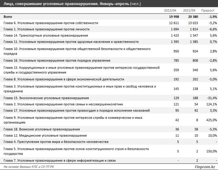 Чаще всего за январь – апрель 2022 года в Казахстане преступники совершали правонарушения против собственности: 63,1 процента от общей численности, или 12,6 тысячи человек, - на 3,2 процента меньше, чем годом ранее. В этом сегменте чаще всего попадались на кражах, мошенничестве, мелких хищениях, грабежах, присвоении или растрате вверенного чужого имущества, неправомерном завладении автомобилем или иным транспортным средством без цели хищения.