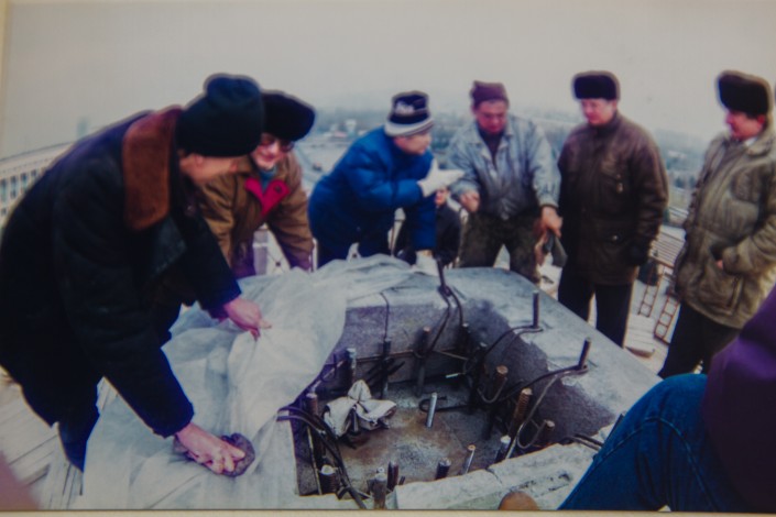 Перед установкой Золотого воина на вершине стелы строители проверяли готовность основы. Фото из альбома Болата Сауранбаева