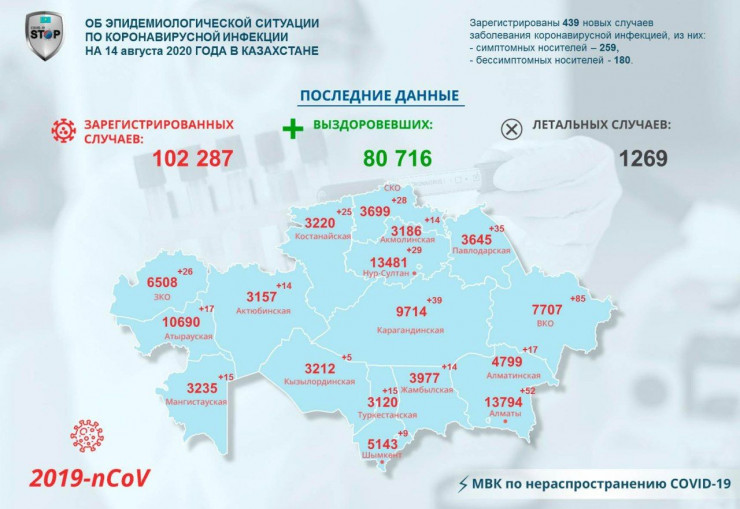 За прошедшие сутки (по данным на 14 августа) в Казахстане зарегистрированы 439 заболевших коронавирусной инфекцией, сообщает Tengrinews.kz со ссылкой на МВК по нераспространению COVID-19.