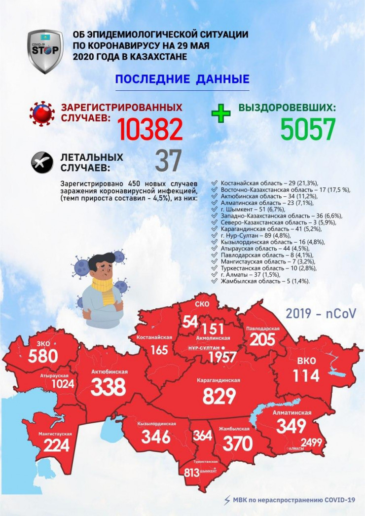 Всего в Казахстане выявлено 10 382 заболевших коронавирусом. Число вылечившихся от COVID-19 пациентов увеличилось до 5057 человек. Летальных случаев - 37.