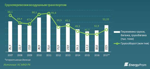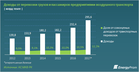 Авиакомпании в РК - в зоне активного роста. Доходы от авиаперевозок увеличились сразу на 27 процентов за год и достигли по итогам 2017 года 295,6 миллиарда тенге - это уже 12,5 процента от совокупных доходов транспортных компаний против 10,5 процента в 2016 году.