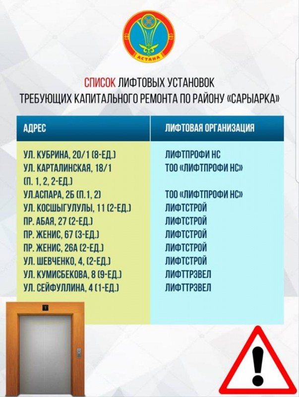 Аким опубликовал список лифтовых установок, требующих замены или капитального ремонта. "Таких лифтов сейчас 78, находящихся в ненадлежащем техническом состоянии", - отметил Арман Турлубек.