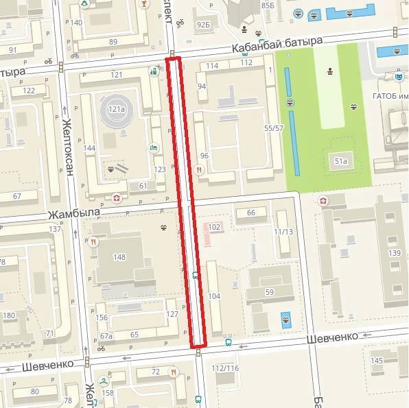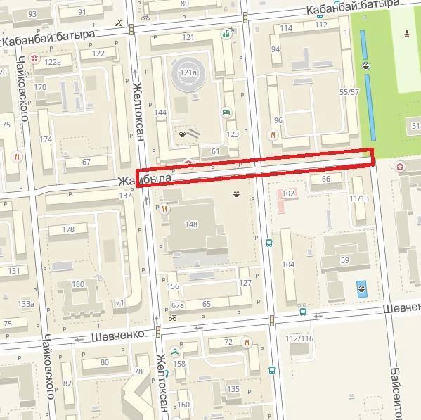 Второй участок находится по улице Жамбыла, на протяжении от Желтоксан до Байсеитовой.