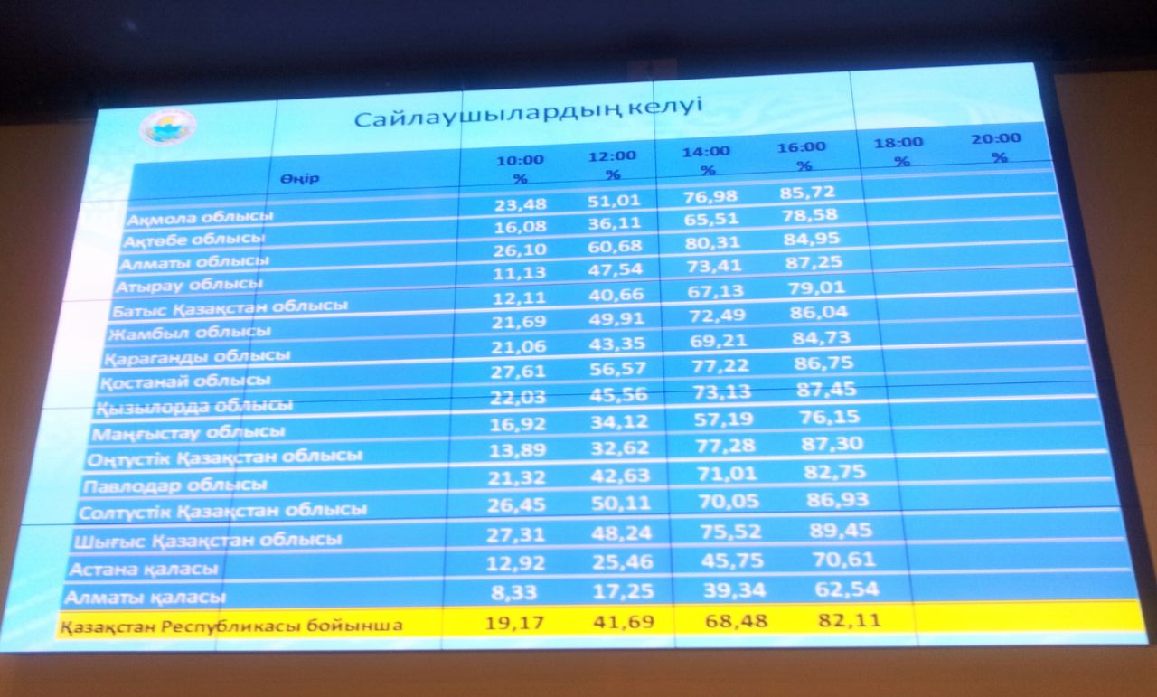 Ранее в ЦИК предоставили данные, согласно которым по состоянию на 14 часов дня по времени Астаны от общего числа избирателей проголосовали 68,48 процента.