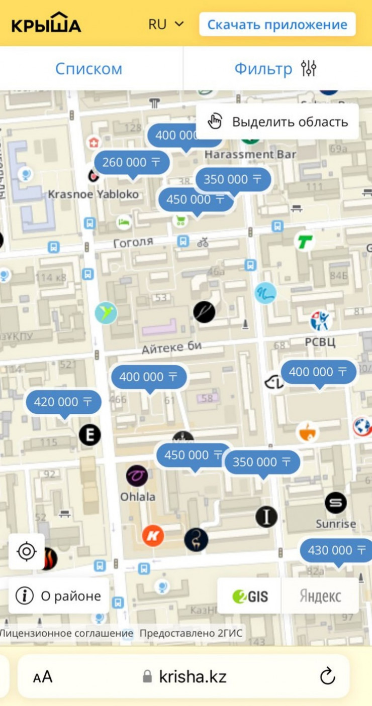 Тем временем на сайте объявлений Krisha.kz стоимость аренды двухкомнатных квартир в районе пересечения улиц Толе би и Сейфуллина находится в диапазоне от 260 до 450 тысяч тенге.