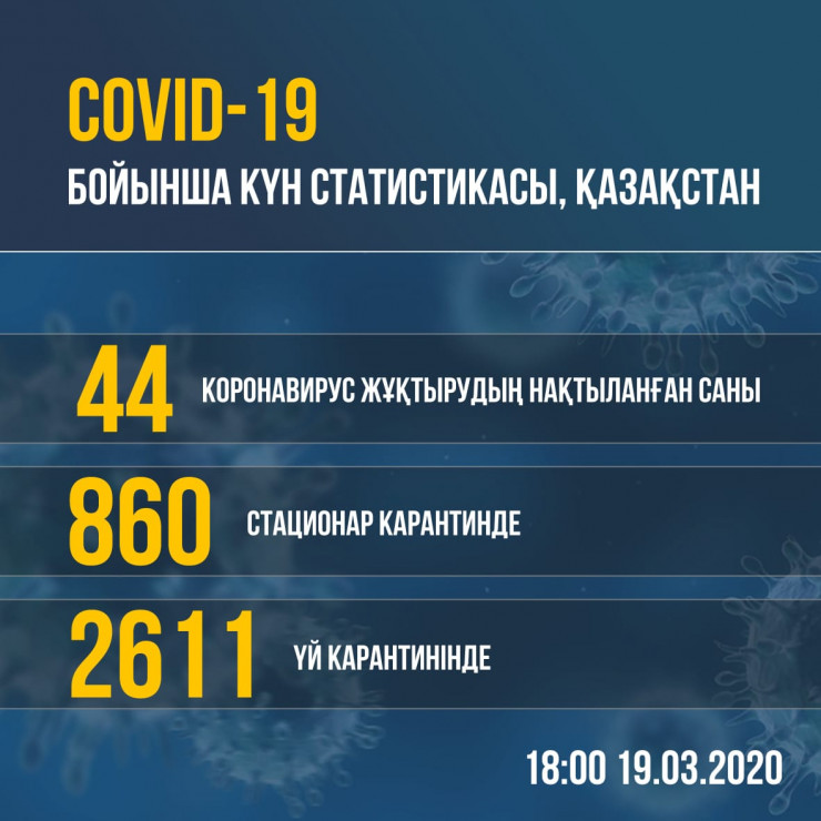 По данным на 18.00, в стране подтверждено 44 случая регистрации коронавируса, из них в Алматы - 19 случаев, в Нур-Султане - 25 случаев. На стационарном карантине находятся 860 человек, на домашнем карантине - 2611 человек.