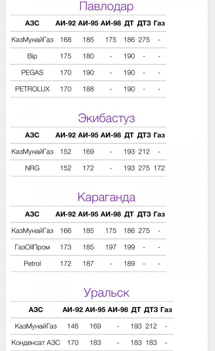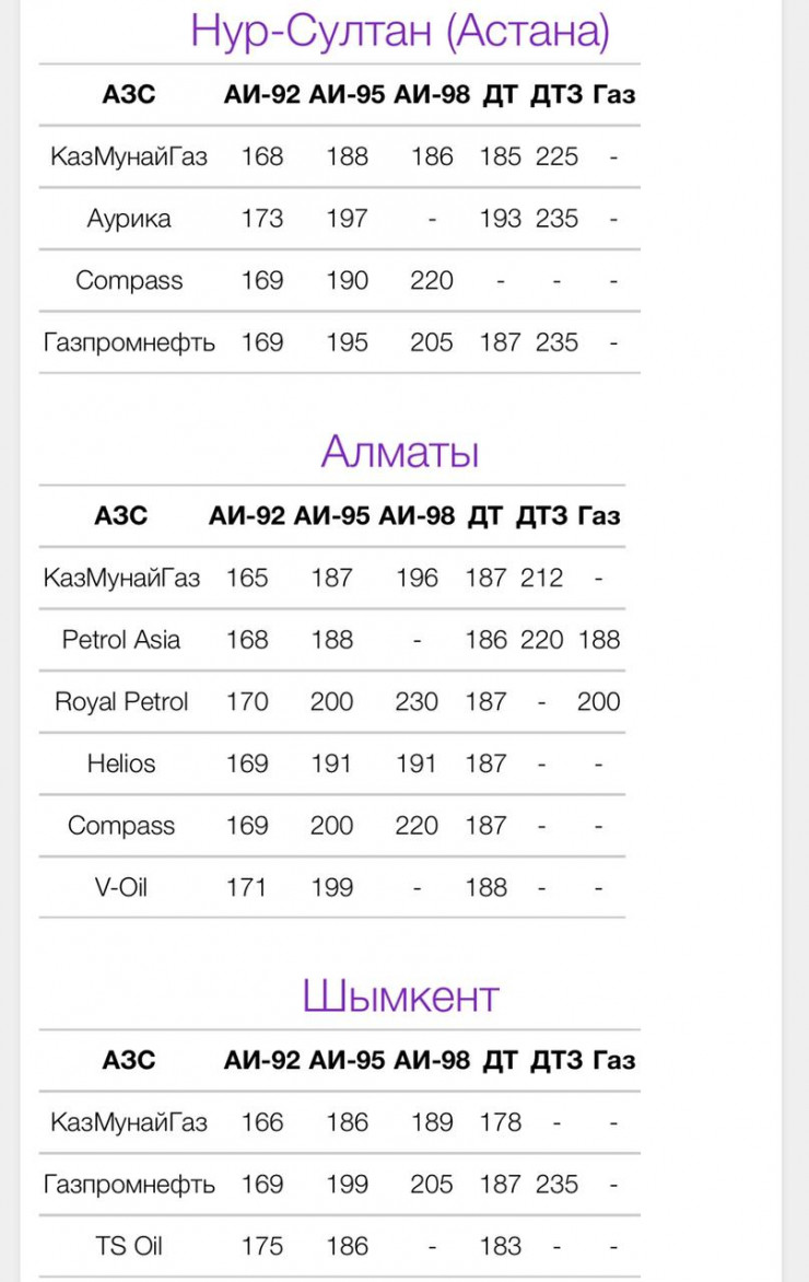 Так, в Нур-Султане стоимость АИ-92 составляет от 168 до 177 тенге за литр, АИ-95 - от 188 до 197 тенге, АИ-98 - от 186 до 220 тенге.