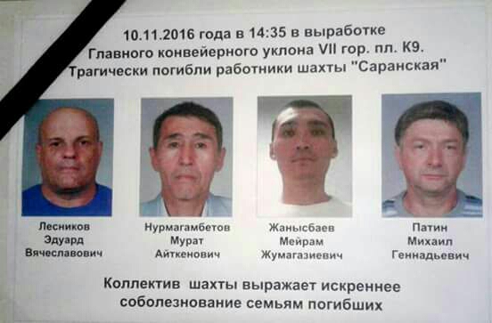 Напомним, ЧП произошло 10 ноября на шахте "Саранская". На месте погибли три горняка, еще пятеро были доставлены в клинику имени профессора Макажанова. Позже один из госпитализированных скончался. По предварительным данным, на шахте произошел обрыв подвесной дороги, на которой находилось транспортировочное устройство с людьми. Расследованием причины трагедии занимается специальная комиссия из МИР РК. В АО "АрселорМиттал Темиртау"выразили соболезнования родным погибших и пообещали оказать им посильную помощь. Также они озвучили предварительную причину трагедии. По версии "АрселорМиттал Темиртау", погибшие и пострадавшие шахтеры не выполнили требования техники безопасности и использовали транспорт, не соответствующий техническим стандартам.