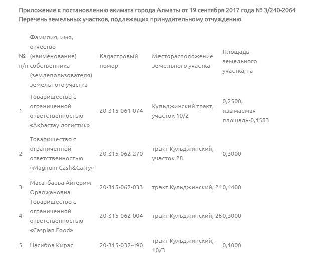 В приложении к постановлению публикуется перечень земельных участков, подлежащих принудительному отчуждению. Среди попавших в список землепользователей - ТОО "Magnum Cash&Carry", ТОО "Caspian Food", ТОО "Ақбастау логистик".