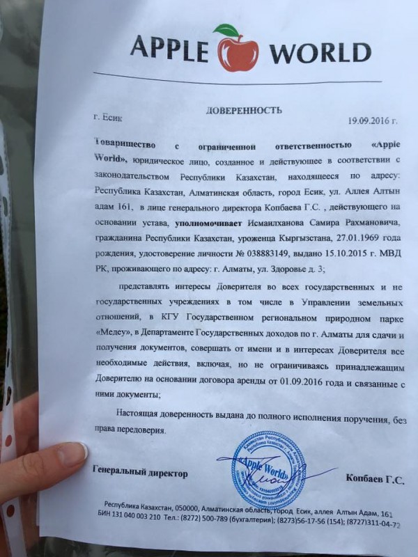 "Прикрываясь бумагами, судя по которым, руководство государственного учреждения "Государственный региональный природный парк "Медеу" в лице Бурибаева заключило соглашение с ТОО "Apple World" на почти 40 гектаров садов. Даже прибыль планируют получать. ТОО должно 10 процентов от "конных прогулок и пр." перечислять парку "Медеу". А сад тем временем вырубают сплошняком уже два дня.