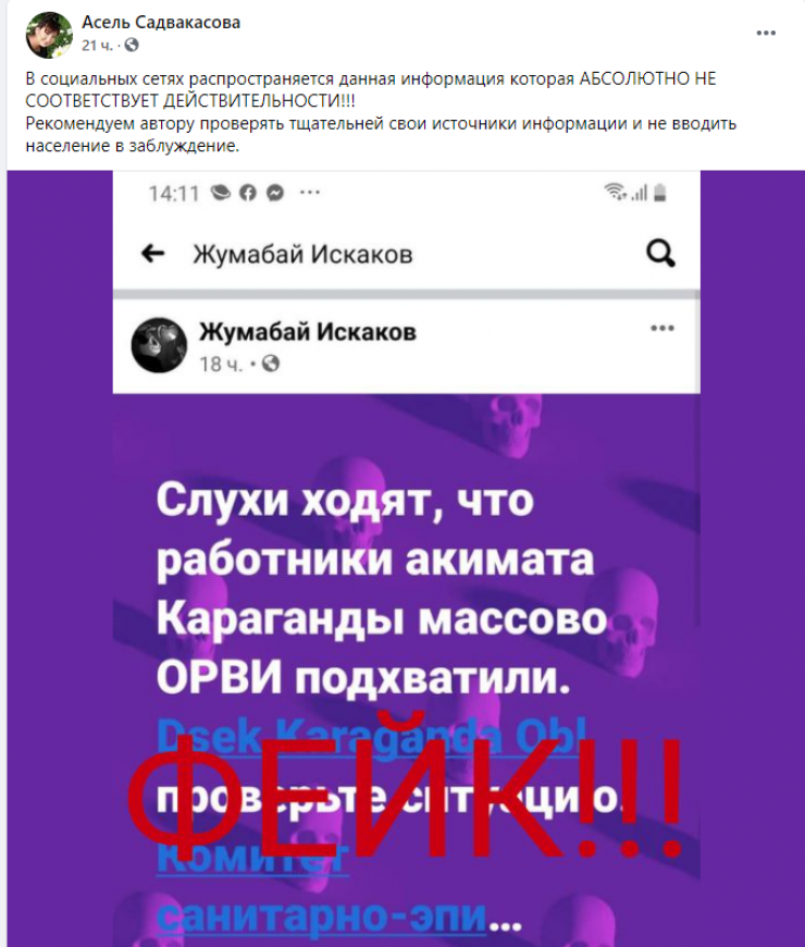 Пресс-секретарь акимата Караганды Асель Садвакасова в ответ на это утверждение сообщила, что оно не соответствует действительности. "Рекомендуем автору проверять тщательнее свои источники информации и не вводить население в заблуждение", - написала пресс-секретарь на странице в Facebook.