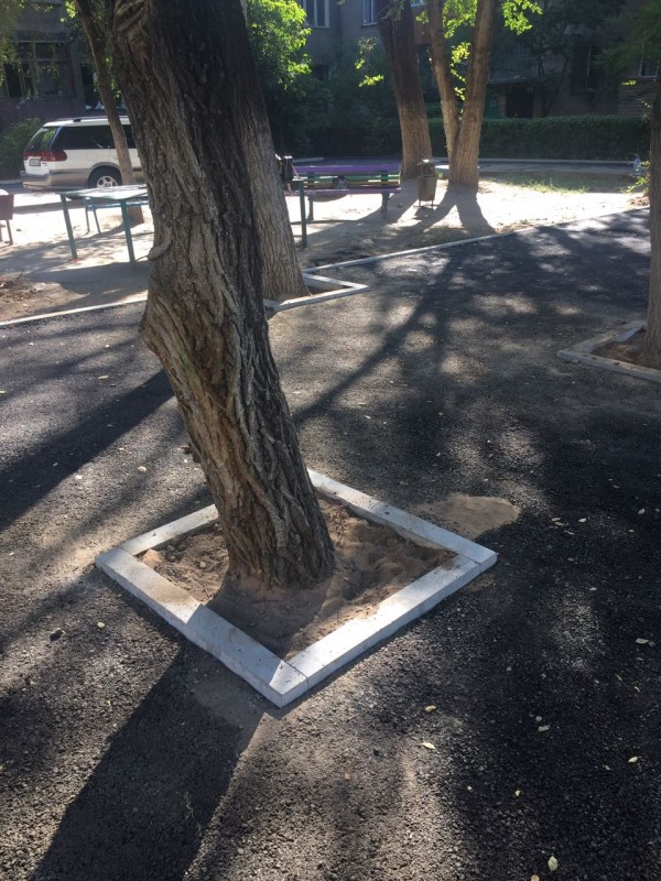 В Алматы снова закатали деревья в асфальт, передает корреспондент Tengrinews.kz. Это произошло в Турксибском районе Алматы, на детской площадке во дворе жилого дома.