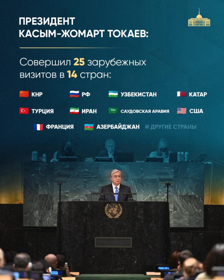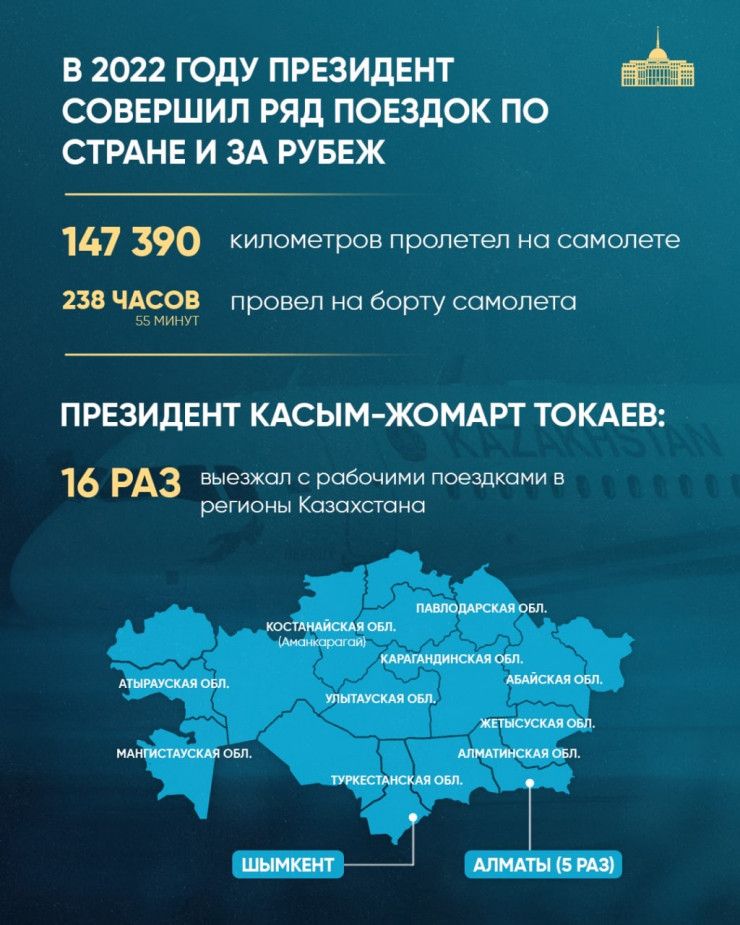 Токаев в 2022 году встретился с главами 19 стран и провел в самолете почти 239 часов. Также Президент 16 раз выезжал с рабочими поездками в регионы страны, совершил 25 зарубежных визитов в 14 стран.