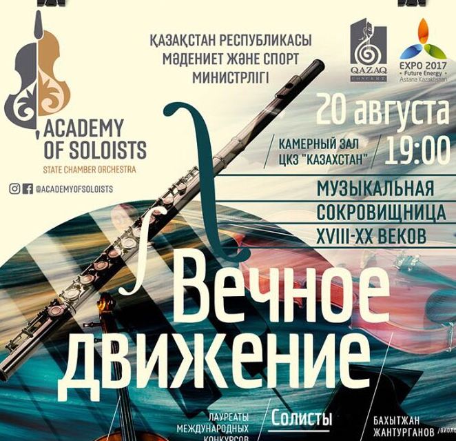 В камерном зале ЦКЗ "Казахстан" академия солистов представит концертный вечер "Вечное движение" из цикла "Энергия музыки". Прозвучат знаменитые камерные произведения, начиная с эпохи барокко и заканчивая композициями современных классиков - Вивальди, Баха, Сен-Санса, Боттезини и других. Музыканты покажут эволюцию и непрерывное развитие музыкального исполнительства на фоне прошедших столетий и в современной трактовке признанных мастеров исполнительского искусства Казахстана.
