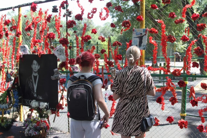 В годовщину гибели Дениса Тена казахстанцы несут цветы и игрушки к его памятнику в Алматы, передает корреспондент Tengrinews.kz.
