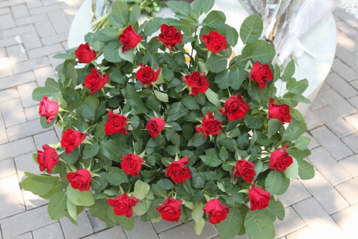 Мамы и бабушки дают детям в руки цветы, чтобы те сами возложили их к небольшому импровизированному алтарю с черно-белой фотографией Дениса.