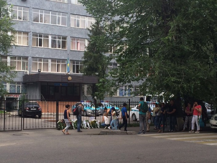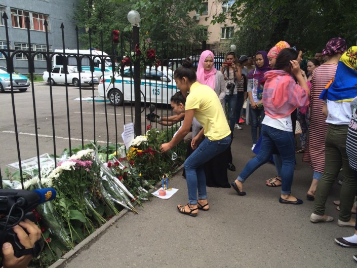 Горожане выражают скорбь у здания Алмалинского РУВД, здесь с утра лежат цветы, люди зажигают свечи и пишут слова соболезнования.