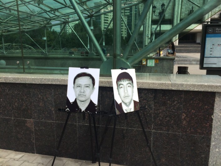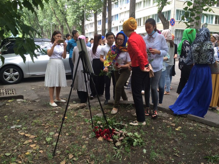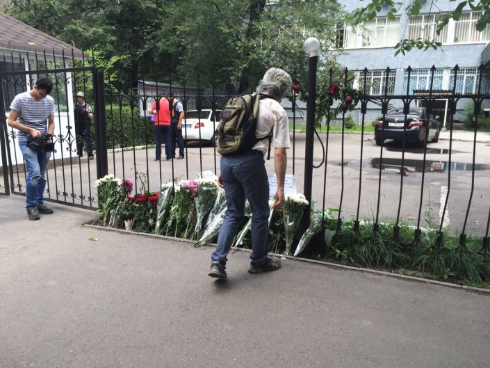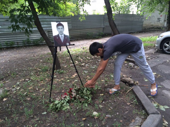 Напротив здания Департамента комитета национальной безопасности (ДКНБ) по городу Алматы погиб 25-летний младший сержант полиции МПС ДВД Алматы Максат Салимбаев. На месте гибели также установлен портрет погибшего, к которому несут цветы горожане.