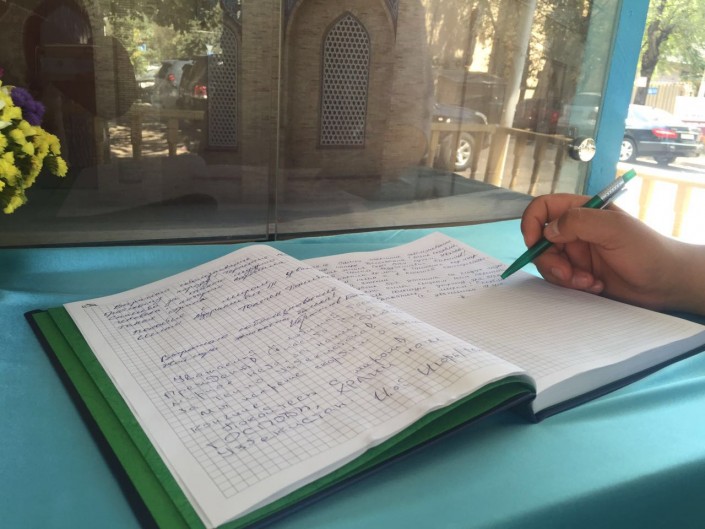 "Наша отчизна, наш узбекский народ понесли огромную утрату. 2 сентября ушел из жизни выдающийся государственный деятель, первый президент Узбекистана Ислам Каримов. Мы скорбим", так с записи посла Узбекистана в Казахстане Икрома Назарова начинается Книга соболезнований.