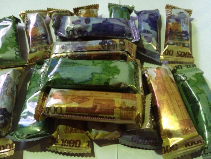 "У меня есть партнеры из России, которые производят кондитерские изделия. Там функционирует целая фабрика про производству таких шоколадных конфет. Они уже давно выпускают подобные конфеты с оберткой в виде доллара и евро. После того, как я предложил им идею с тенге, мы запустили совместный проект. Реализуем мы продукцию в Алматы, Шымкенте, Астане и ряде других северных городов страны", - поделился он.