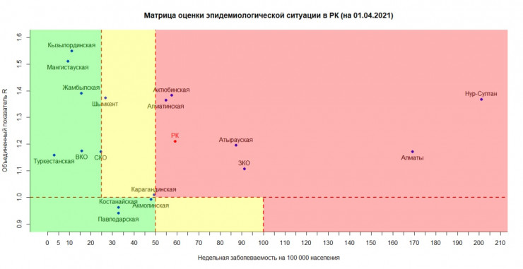 Согласно матрице оценки эпидемиологической ситуации в регионах Казахстана на 1 апреля, в "красной" зоне: Нур-Султан, Алматы, Алматинская, Атырауская, Актюбинская и Западно-Казахстанская области.