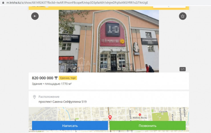 На сайте Krisha.kz появилось объявление о продаже объекта недвижимости площадью 1770 квадратных метров 1950 года постройки. В объявлении указана цена - 820 миллионов тенге. В объявлении также указано, что здание имеет 4 уровня, кирпичное.