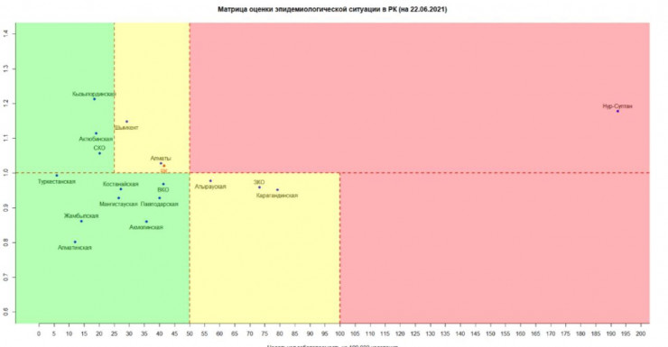 Согласно матрице оценки эпидемиологической ситуации в регионах Казахстана на 22 июня, в "красной" зоне находится Нур-Султан.