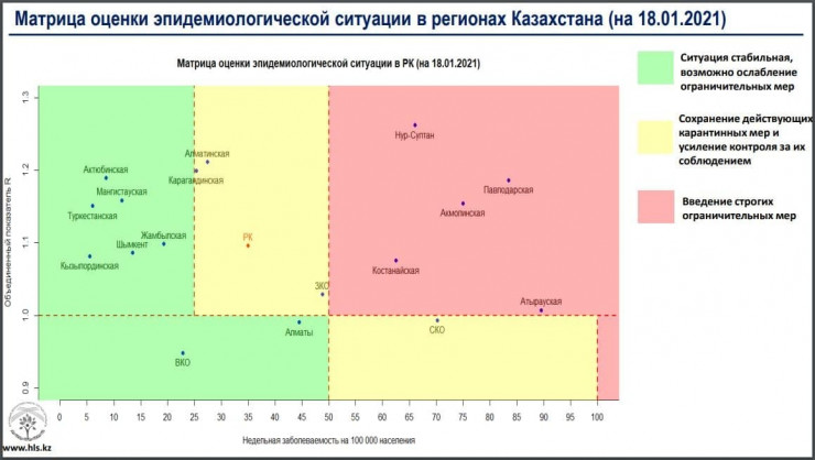 Сообщается, что, помимо Алматы, в "зеленую" зону по-прежнему входят Актюбинская, Мангистауская, Туркестанская, Жамбылская, Кызылординская, Восточно-Казахстанская области.
