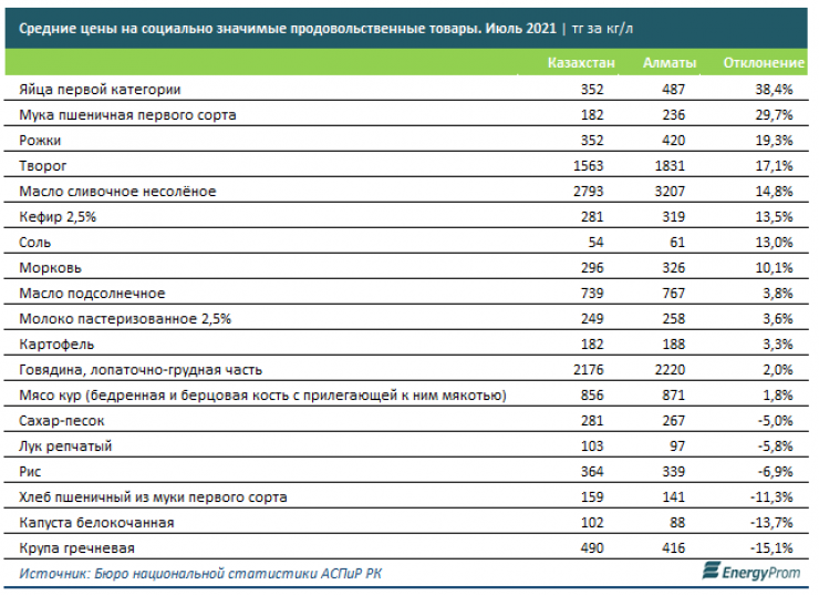 Несмотря на это, при сравнении цена на жизнь в других регионах Казахстана жизнь в Алматы выходит достаточно дорогой. В социальной продовольственной корзине из 19 продуктов по 12 позициям цены в Алматы выше, чем в среднем по стране, причем по 8 из них - более чем на 10 процентов. Так, значительно выше ценники на пшеничную муку первого сорта (29,7 процента) и яйца первой категории (сразу 38,4 процента).