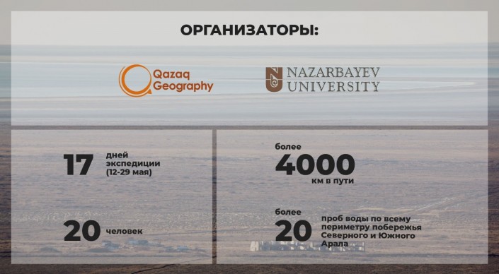 "Экспедиция на Аральское море - 2019 была организована республиканским общественным объединением QazaqGeography совместно с Назарбаев Университетом. Мы выехали 12 мая и за 17 дней проехали свыше 4 тысяч километров. Основной целью было изучение Аральского моря, на что мы потратили больше половины всех экспедиционных дней. В отличие от экспедиции 2018 года, были добавлены точки отбора воды (более 20 проб).