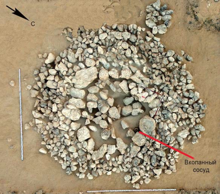Куски известняка и кремня лежали на древней поверхности в один-два слоя. Основной массив камня был сосредоточен в южном секторе и представлял собой выброс, образовавшийся после "грабительских" раскопок.