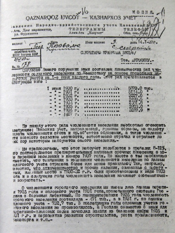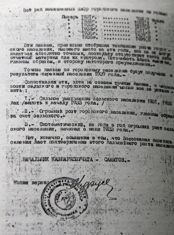 "Мен бұл архивке Елбасы Нұрсұлтан Назарбаевтың атынан барып қана кіре алдым. Мен онда барып, 37-жылғы санақ материалдарын іздедім. Яғни ашаршылыққа дейін халық саны қанша болғаны және зұлматтан кейінгі саны қанша болғаны жайлы толық мәлімет бар. Оның ішінде концлагерьде қанша адам болғаны, Қытайға қанша адамның кеткені туралы мәліметтер бар", - дейді ғалым. Оның айтуынша, санақ басқармасының маңызы - ондағы санақ жүйелері батыстағыдай компьютермен жабдықталғандығында.