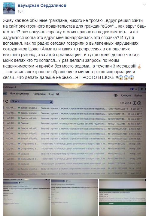 "Живу как все обычные граждане, никого не трогаю... Вдруг решил зайти на сайт электронного правительства для граждан eGov. Вдруг, бац, - кто-то 17 раз получал справку о моих правах на недвижимость. (...) И тут до меня дошло, что и в моих делах кто-то копался. Семь раз делали запросы по моей недвижимости, причем без моего ведома, в течение трех месяцев! Составил электронное обращение в Министерство информации и связи (Министерство информации и коммуникаций - прим.)... Что делать дальше - не знаю. Я просто в шоке", - написал Бауыржан Сердалинов.