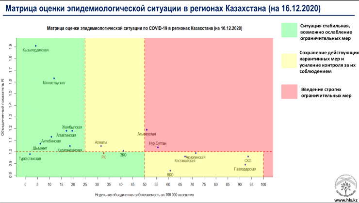Ранее в "красную" зону вошла столица. По данным Министерства здравоохранения на 10 декабря, в "красной" зоне также находилась Павлодарская область. Но 16 декабря область перешла в "желтую".