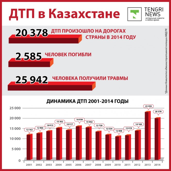 Tengrinews.kz предлагает ознакомиться с данными Комитета административной полиции МВД о состоянии аварийности на дорогах республики за 2014 год.