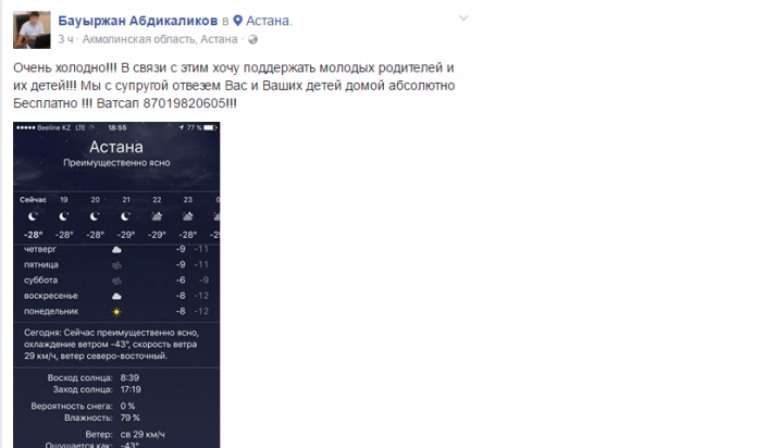 "Очень холодно!!! В связи с этим хочу поддержать молодых родителей и их детей!!! Мы с супругой отвезем Вас и Ваших детей домой абсолютно Бесплатно!!!", - такие сообщения пишут жители Астаны в соцсети Facebook.