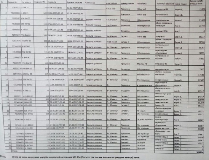 В автопарке "Мадина" сообщили, что в июне 2017 года зафиксировано 32 случая сбоя в работе терминалов "Онай". Каждый час простоя перевозчик оценил в 5000 тенге. Таким образом компания понесла убытки в размере 503 тысяч 834 тенге.