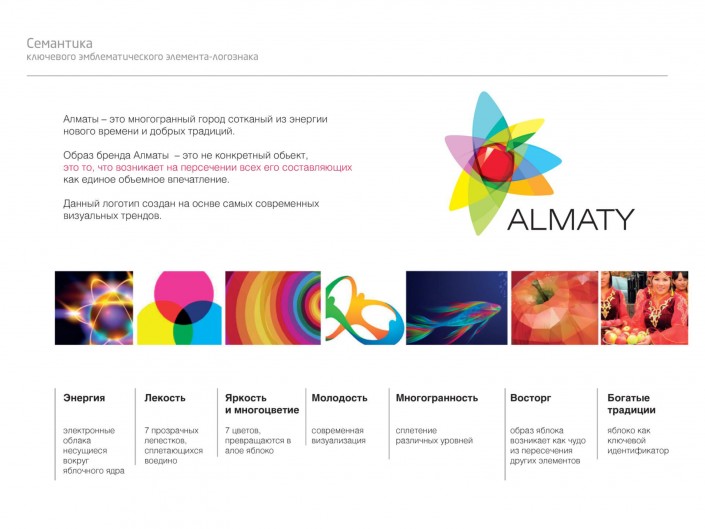 Напомним, что ранее было выбрано ТОП-25 лучших работ рекламных агентств, художников, дизайнеров, архитекторов, а также студентов для брендбука Алматы. Всего было принято 109 работ, из которых члены экспертной комиссии выбрали наиболее красочные версии. Согласно положению конкурса, авторы брендбука должны были подготовить логотип города, разработать колористику и цветовую гамму бренда, использовать мотивы орнаментальной и декоративной пластики, разработать применение элементов графики в городской среде при праздничном оформлении, придумать фотостиль в имиджевом оформлении города, придумать оформление городского транспорта, остановок и навигации в городе и разработать оформление сувенирной продукции.