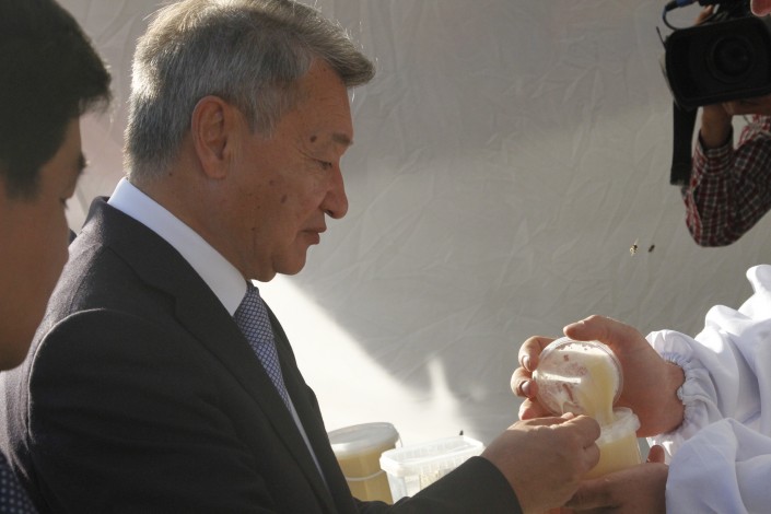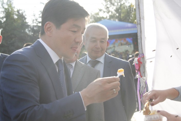 По ярмарке прошлись акимы Даниал Ахметов и Бауыржан Байбек, которые попробовали несколько сортов меда. Пчеловоды подарили главе города около пяти килограммов меда.