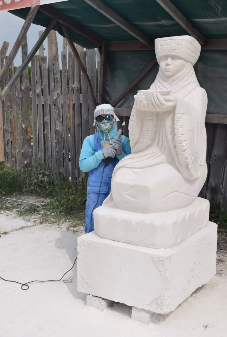 Над трехметровой скульптурой хрупкая девушка работала одна. По словам Тамилы, работа с камнем или глиной - нелегкий и даже вредный труд, потому что приходится дышать едкими парами и пылью. Но девушка не представляет жизни без камня.