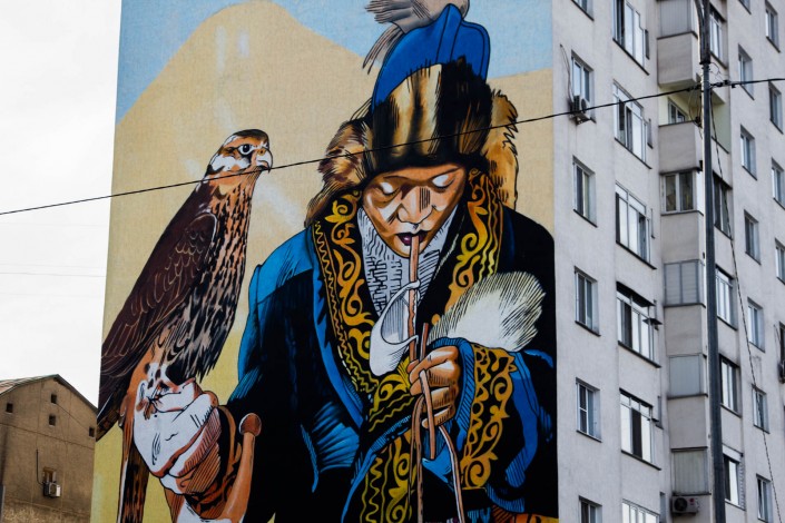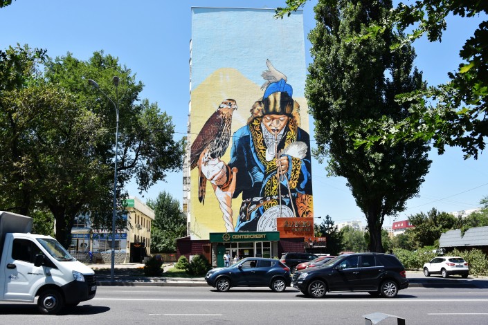 На высотном здании по улице Розыбакиева появился портрет беркутчи. Автор работы - украинский художник Андрей Пальваль.