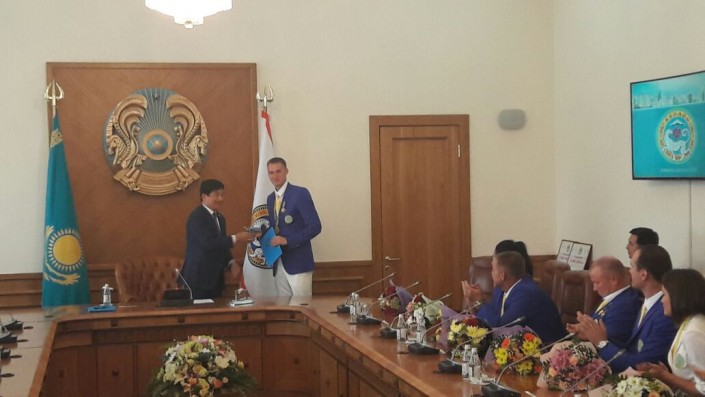 26 августа в Астане прошла церемония чествования олимпийских чемпионов и призеров Игр. Глава государства Нурсултан Назарбаев поздравил спортсменов с успешным выступлением, а также отметил, что это подарок к 25-летию независимости Казахстана.