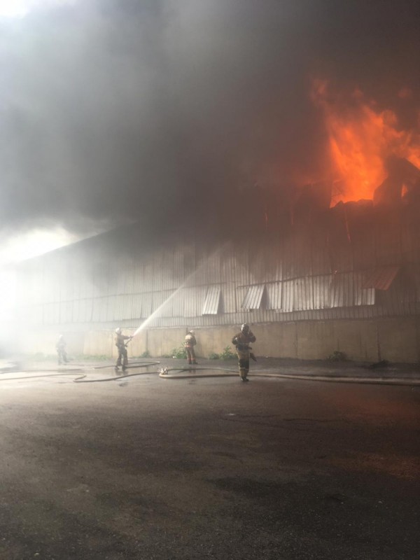 Горит одноэтажный склад, где хранятся металлопластиковые изделия. Существует угроза перекидывания огня на рядом расположенные складские помещения.