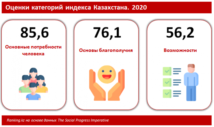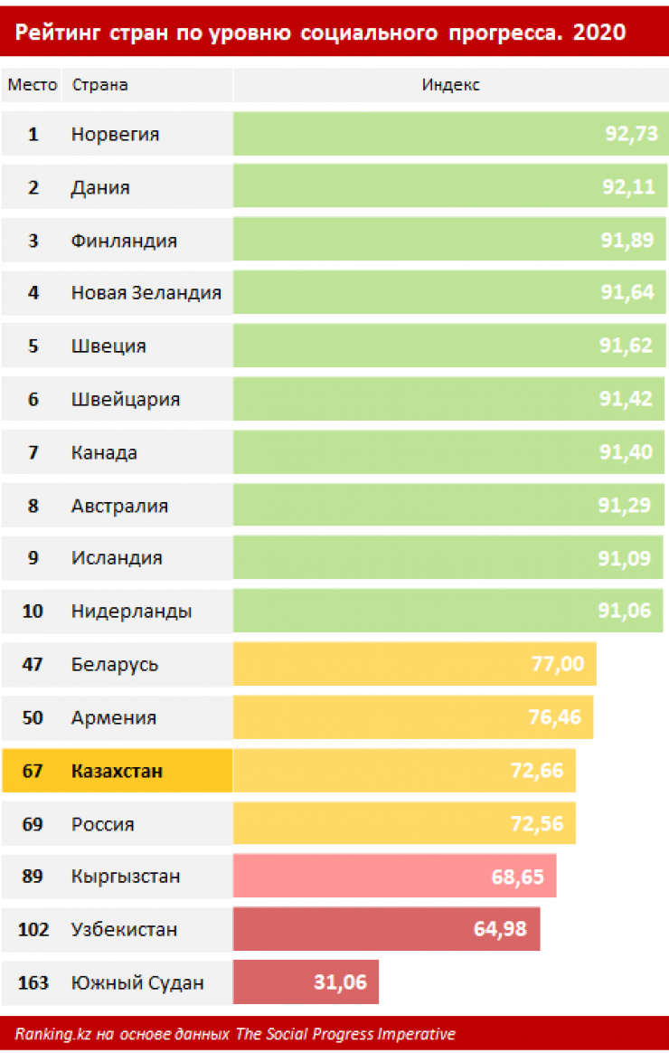 В рейтинге стран по уровню социального прогресса Казахстан занял 67-е место из 163, уступив Беларуси и Армении и обогнав соседей - Россию, Кыргызстан, Узбекистан. Индекс Казахстана составил 72,66 балла из 100, передает Tengrinews.kz со ссылкой на Ranking.kz.