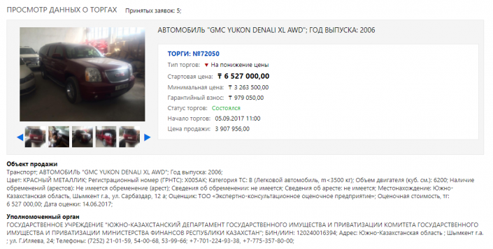 Внедорожник GMC ранее выставлялся на торги по цене 6 527 000 тенге. Торги по нему также состоялись, автомобиль продан за 3 907 956 тенге.