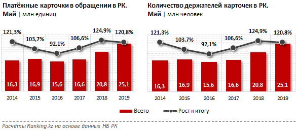 На конец мая текущего года в обращении находятся 25,1 миллиона платежных карточек, за год их количество увеличилось на 20,8 процента. Количество держателей карточек увеличилось на 20,2 процента за год и достигло 21,8 миллиона человек. Годовой рост составлял 21,7 процента. Наибольшую часть рынка традиционно занимают дебетовые карточки: 18,9 миллиона единиц, доля составляет 75,3 процента. Доля кредитных карточек составила 20,8 процента (5,2 миллиона единиц).