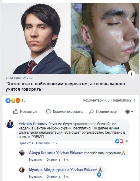 На своей странице в Facebook журналист Айнур Коскина поделилась публикацией Tengrinews.kz и поинтересовалась у министра здравоохранения по поводу помощи семье пострадавших.