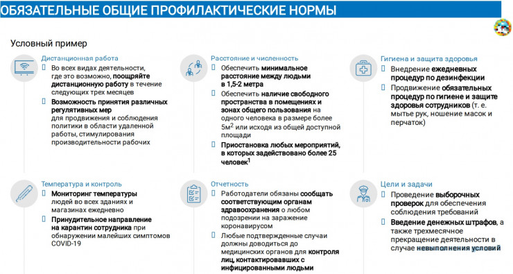 Глава города представил обязательные общие профилактические нормы. По его словам, после 20 апреля в городе будут проводиться выборочные проверки для "обеспечения соблюдения требований". В случае невыполнения условий предусмотрено введение денежных штрафов, а также трехмесячное прекращение деятельности для бизнесменов.