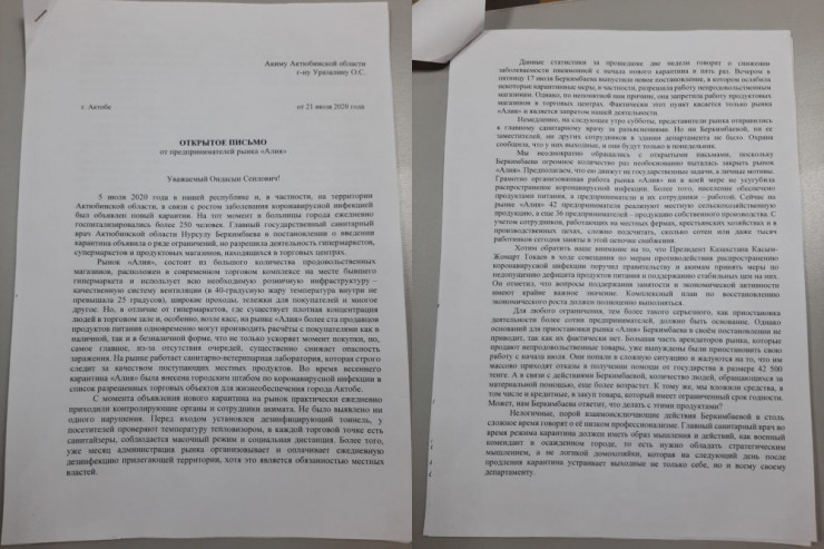 "Фактически этот пункт касается только рынка "Алия" и является запретом нашей деятельности", - утверждают авторы письма.