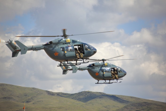 Кроме того, в Боевом параде для десантирования посадочным способом и с использованием специального оборудования (фал) задействованы вертолеты МИ-17, "Хьюи" (справочно: американский многоцелевой вертолет фирмы Bell Helicopter Textron, также известный как "Хьюи" (Huey), Е-145 (еврокоптер), а для нанесения ракетных ударов - МИ-35.